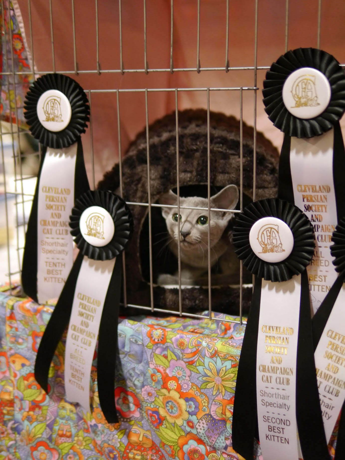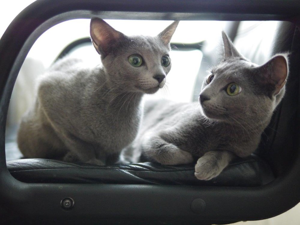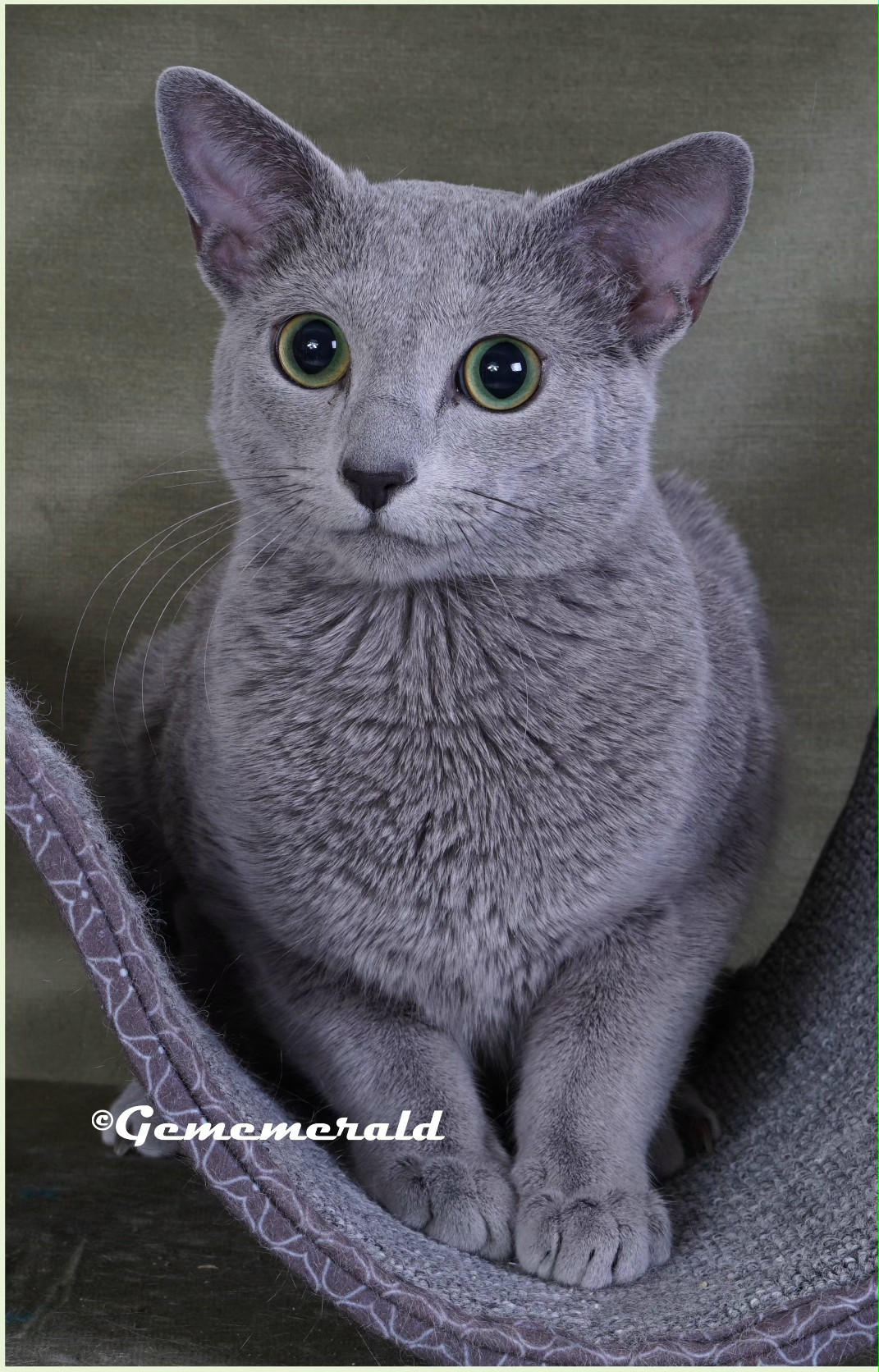 Our Russian Blues from the Latvia lineage are much the same but darker, with a more powerful facial structure comapred to the delicate looks of the American Russian Blues. You can see the difference in the thumbnail with the American Russian Blue Pikachu (the cat on the left) and Latvian lineage Pickle. Both have now retired.